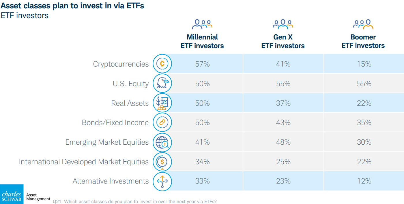 Aracı kurum devi Schwab Asset Management’ın bir raporuna göre, borsa yatırım fonu (ETF) yatırımcılarının neredeyse yarısı, tahvil ETF’si alacağını söyleyenlerle aynı seviyede bir kripto ETF satın almayı planlıyor.